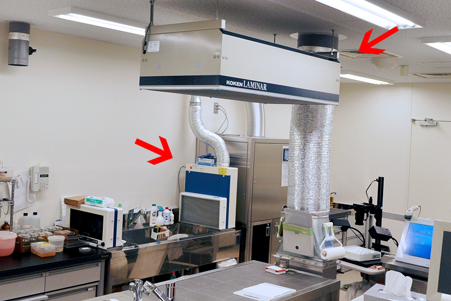 ホルマリン対策として局所排気装置を設置し作業者の曝露防止対策を行っています。年2回の作業環境設定では、第I管理区分で良好な環境を維持しています。