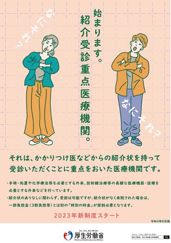 原則として紹介状のありなしにかかわらず受診は可能ですが、紹介状を持参されず来院された場合は、一部負担金(3割負担等)とは別に 「特別の料金(初診に係る選定療養費)」が必要となります。