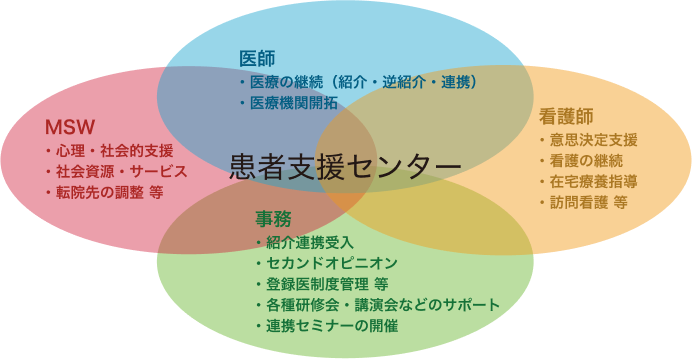 当院の患者支援センターは、看護師や社会福祉士を含めた多職種連携により、1.地域医療連携係、2.入退院支援係、3.患者サービス係を運営しております。当センターは、患者さんの視点に立った最善の医療の推進を図ることを目的としております。