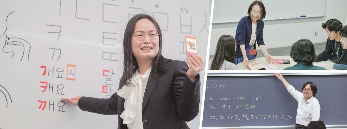 中国語コース・韓国語コースでは、週5回の演習を通して、それぞれの言語の発音・文法・語彙の基礎を身につけます。日本語・日本語教育コースでは、主要外国語である英語に加え、さらに1言語以上の外国語を学びます。