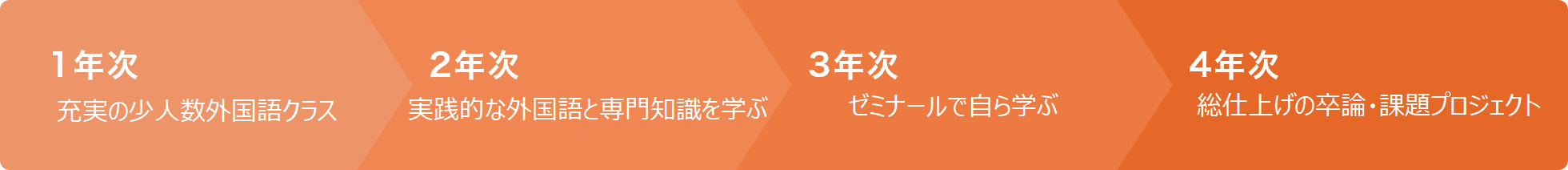 これまでに身につけた外国語力や専門知識、課題解決力を生かし、卒業論文や卒業課題プロジェクトに取り組みます。また、これまでの学びや取り組みを社会やキャリアにつなげていきます。