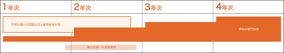 中国語コース・韓国語コースでは、それぞれの言語について週3回の演習を行い、中級レベルの語学力の習得を目指します。日本語・日本語教育コースは、引き続き、英語に加えてさらに外国語を学び、多様な言語運用能力の向上を図ります。加えて、専門科目を通じて日本・中国・韓国の社会・文化への理解を深めます。英語圏・中国語圏・韓国語圏への半年または1年の留学も奨励しています。