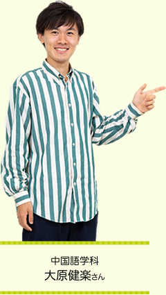 中国語を学び始める理由は何でも構いません。新しい言語を学び始めるのは不安かもしれませんが、私も含めほとんどの学生はゼロスタートで、3年次には検定上級を取得できるまでに成長しています。英語の他に中国語もできるという理由で、バイトの給料が良かったり、就活でも一目置いてもらえたりと私は色んなところで得しています。英語だけができる人は沢山います。英語に加えて、中国語を今のうちから学んでおけば、さらに多くのチャンスを掴めます。