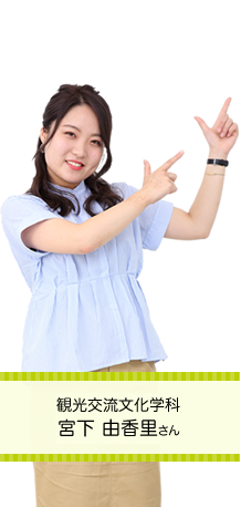 私は、将来のツアーコンダクターの夢を叶えるために外国語学部観光交流文化学科に入学をしました。自分が学びたいと思う学習が存分にでき、自分の夢に一歩ずつ近づいているのを感じています。自分の夢がまだ決まっていなくても、さまざまな分野のプロフェッショナルの先生が親身に相談に乗ってくれたり、自分の経験を積める学習プログラムに参加したりすることで、自分が成長することを肌で実感することができます。観光といっても様々分野がありますので、興味を持った分野にどんどんチャレンジしていきましょう! ぜひ、杏林大学で一緒に学びましょう!(宮下)