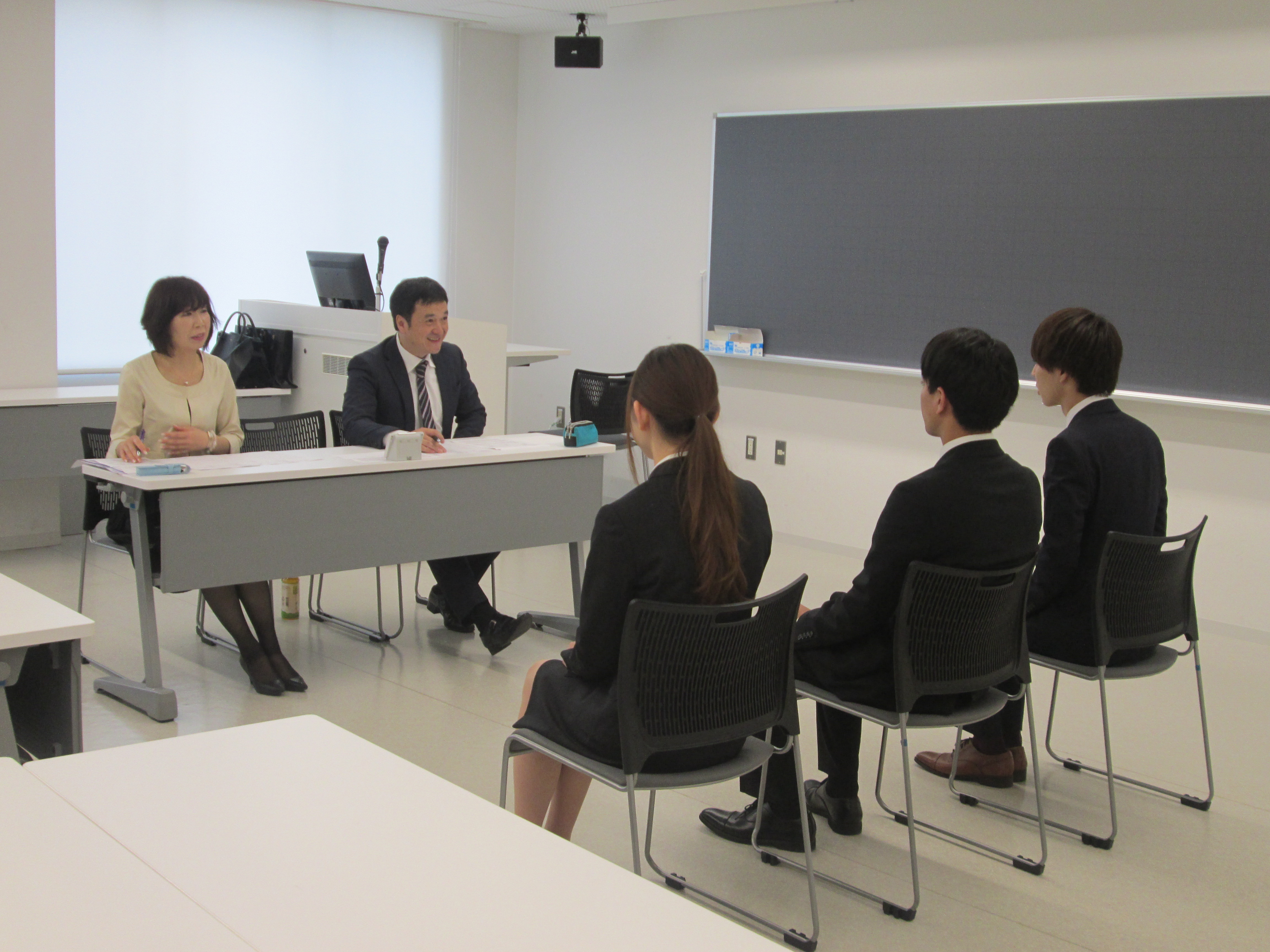 2・3年次を対象としたキャリア科目。企業や市役所で短期間の就業体験をします。実際に会社での業務を体験できるだけでなく、派遣先の社員の方との交流などを通じて、必要な社会人スキル等についても知ることができます。インターンシップ終了後は、授業で報告会を行い、各自の経験や情報を共有します。インターンシップを通じて、業務に対する印象や意識が変化したり、自分自身への理解が深まったりすることもあります。3年生にとっては、後に控える就職活動において進路を決定する際の、重要な検討材料ともなります。