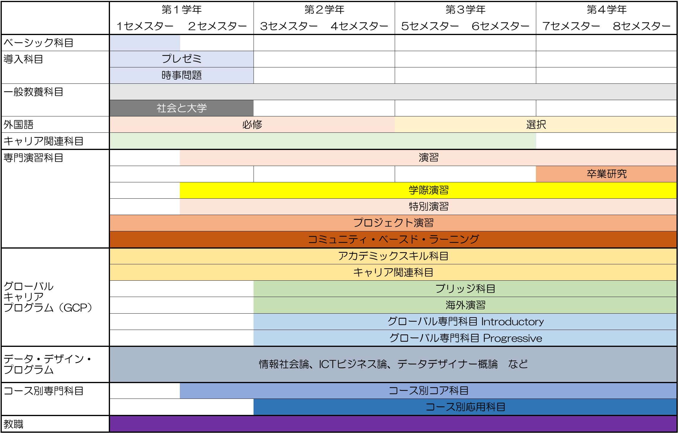 総合政策学部では、第1学年秋学期(2セメスター)より、コース別開講科目の履修が始まります。1年次にはベーシック科目で学んだ各コースの内容を深めてもらい、2年次からは各コースにおいて専門性を高めていく上で核となる科目を置いています。コア科目を通じて、応用科目を学ぶ上での基礎的な知識を身につけることもできます。