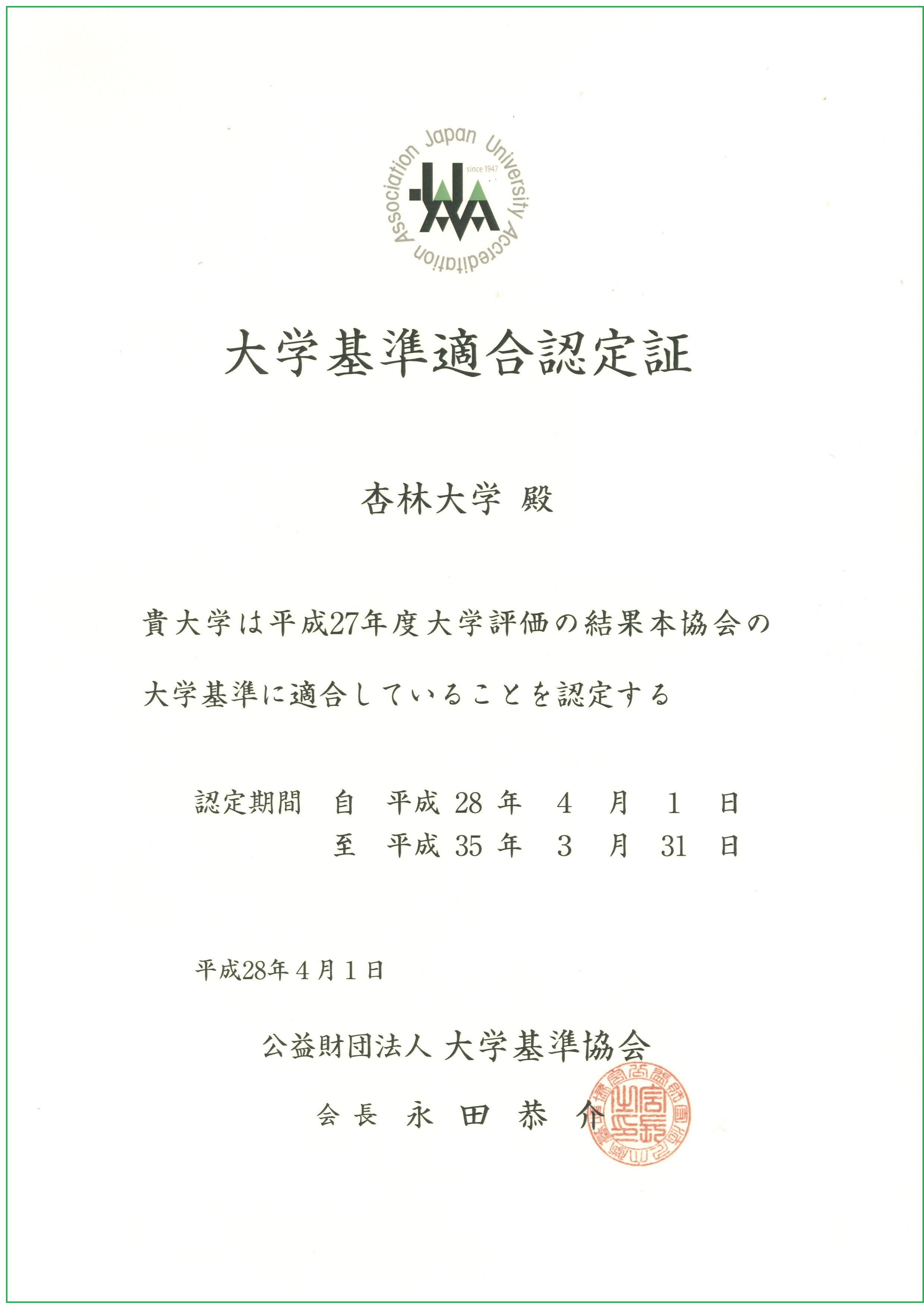 杏林大学は、平成27(2015)年度に公益財団法人 大学基準協会の大学評価(認証評価)を受審した結果、同協会の定める大学基準に適合しているものと認定されました。
