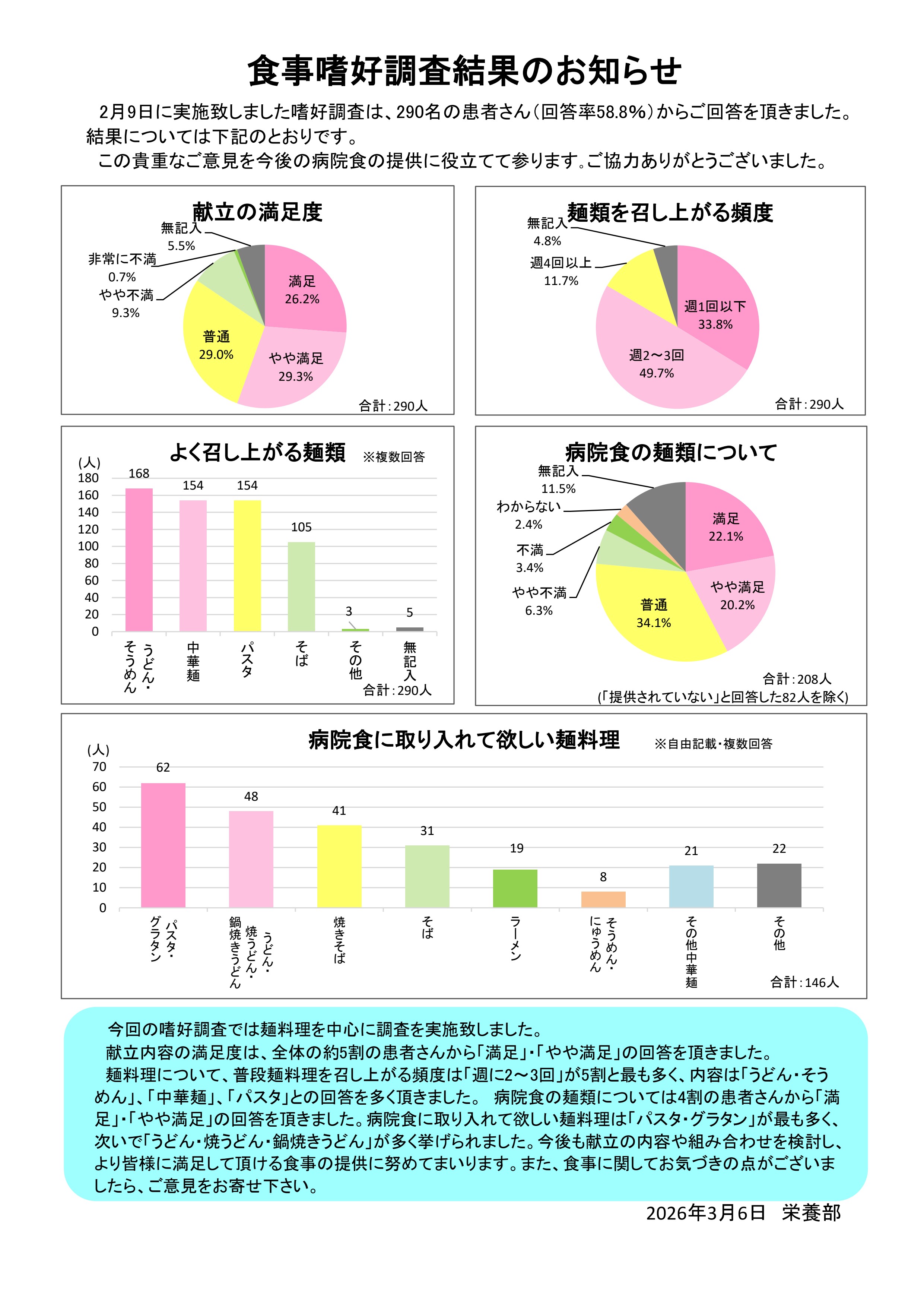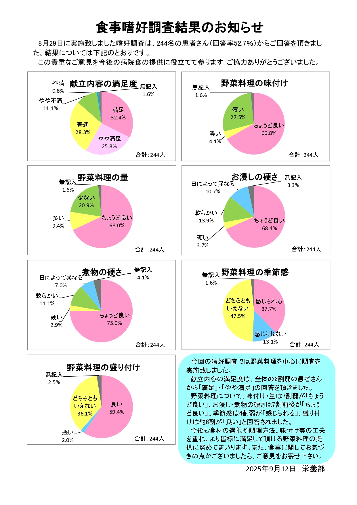 栄養部では年4回、嗜好調査を行い、入院患者の皆さんに患者食の満足度や感想などを伺っています。