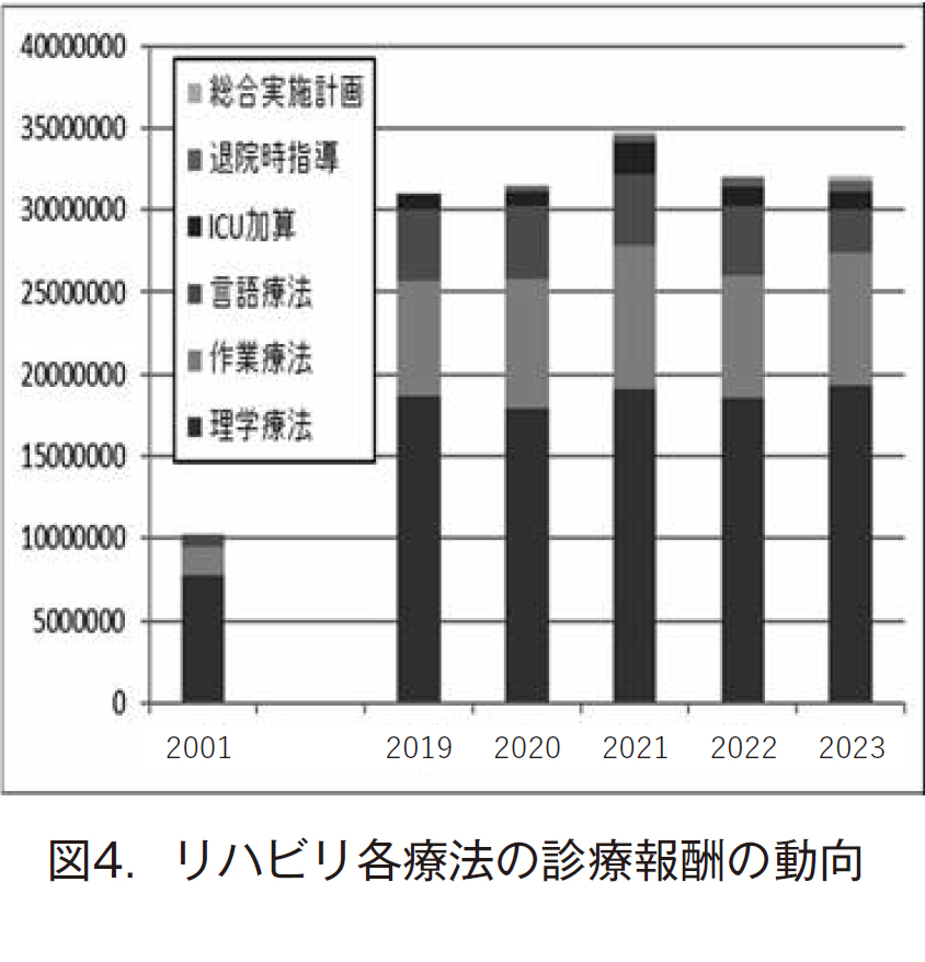 リハビリは保険診療報酬の規定によって、療法士 1名あたりが 1日に治療できる患者数の上限が決められている。そこで患者数の増加に対応すべく2008年度にはPT11名、OT3名、ST2名の体制から、現在のPT25名、OT10名、ST2名の体制に至った。図3、4のごとく、2023年度の延べ患者数(リハビリ実施回数)、診療報酬(点数)において2022年度とほぼ同様の結果となった。リハビリ室の人員としての増員は図られているが、産休・育休代替職員の不在や、STの人員不足は大きな要因と考えられる。