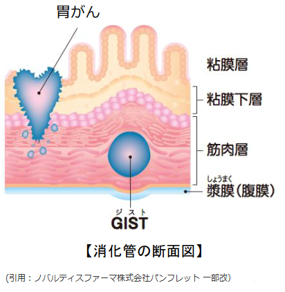 消化管粘膜の下に発生する悪性腫瘍のGIST(Gastrointestinal Stromal Tumor)は日本語で消化管間質(かんしつ)腫瘍と呼ばれます。その発生頻度は、年間10万人に1〜2人で、男女差はないとされています。発生部位は、胃が約50~70%と最も多く認められます。GISTは、消化管粘膜の下の筋層などに存在している細胞や前駆細胞が異常に増殖し、腫瘍化することによって生じます。 発育のタイプとして、消化管の内腔側に発育するタイプ(管内発育型)、消化管壁の外側に発育するタイプ(管外発育型)、その中間(消化管壁内発育型)に分類されます。