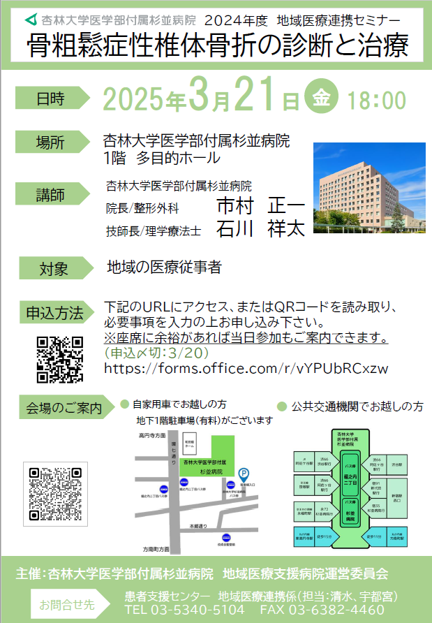 3月21日(金)地域医療連携セミナー「骨粗鬆症性椎体骨折の診断と治療」ご案内 作成日時:2025年02月22日 医療関係者 下記の日程で地域医療連携セミナーを開催します。皆さまのご参加をお待ちしております。申込み:【こちら】から 一覧 病院からのお知らせ一覧 講演会・行事等一覧 医療関係者向けのお知らせ一覧