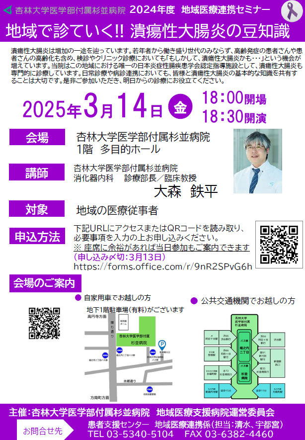 3月14日(金)地域医療連携セミナー「地域で診ていく!! 潰瘍性大腸炎の豆知識」ご案内 作成日時:2025年02月19日 医療関係者 下記の日程で地域医療連携セミナーを開催します。皆さまのご参加をお待ちしております。申込み:【こちら】から 一覧 病院からのお知らせ一覧 講演会・行事等一覧 医療関係者向けのお知らせ一覧