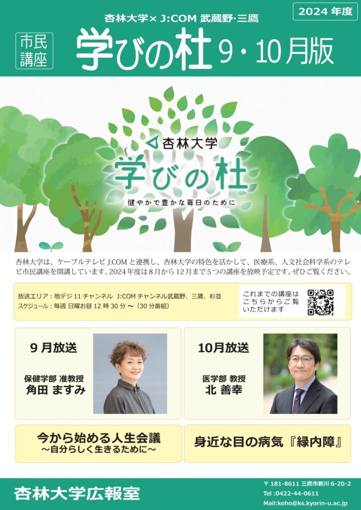 杏林大学では、本学の特色を活かした医療系・人文社会科学系の市民講座”学びの杜”を、ケーブルテレビJ:COMで放送しています。