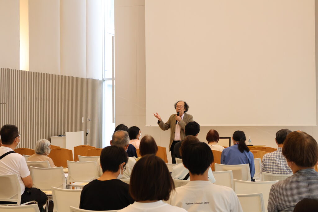 人は、言葉によるコミュニケーションで、正しい表現や理路整然とした説明以上に、言葉の背景や場の空気をつくる“気配”を大切にしているのではないのかと示唆しました。また、松尾芭蕉の「古池や蛙飛び込む水の音」を例に、なぜ「古池に」ではなく、「古池や」なのか、五七五の言葉が織りなす俳句の魅力にも触れました。 さらに、老子の思想である「大器晩成」の元の意味とされる「大器免成‐大器はいつになっても完成しない」を紹介しながら、生涯何かを学び続けることの大切さ、面白さなどについても語りました。