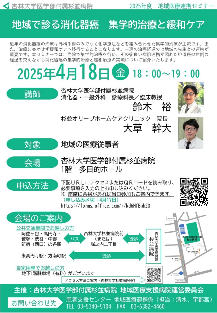 4月18日(金)地域医療連携セミナー「地域で診る消化器癌 集学的治療と緩和ケア」ご案内 作成日時:2025年04月11日 医療関係者 下記の日程で地域医療連携セミナーを開催します。皆さまのご参加をお待ちしております。申込み:【こちら】から 一覧 病院からのお知らせ一覧 講演会・行事等一覧 医療関係者向けのお知らせ一覧