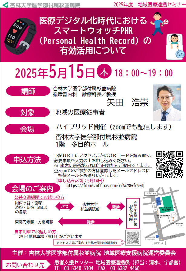 5月15日(木)地域医療連携セミナー「医療デジタル化時代におけるスマートウォッチPHRの有効活用について」ご案内 作成日時:2025年04月14日 医療関係者 下記の日程で地域医療連携セミナーを開催します。皆さまのご参加をお待ちしております。申込み:【こちら】から 一覧 病院からのお知らせ一覧 講演会・行事等一覧 医療関係者向けのお知らせ一覧