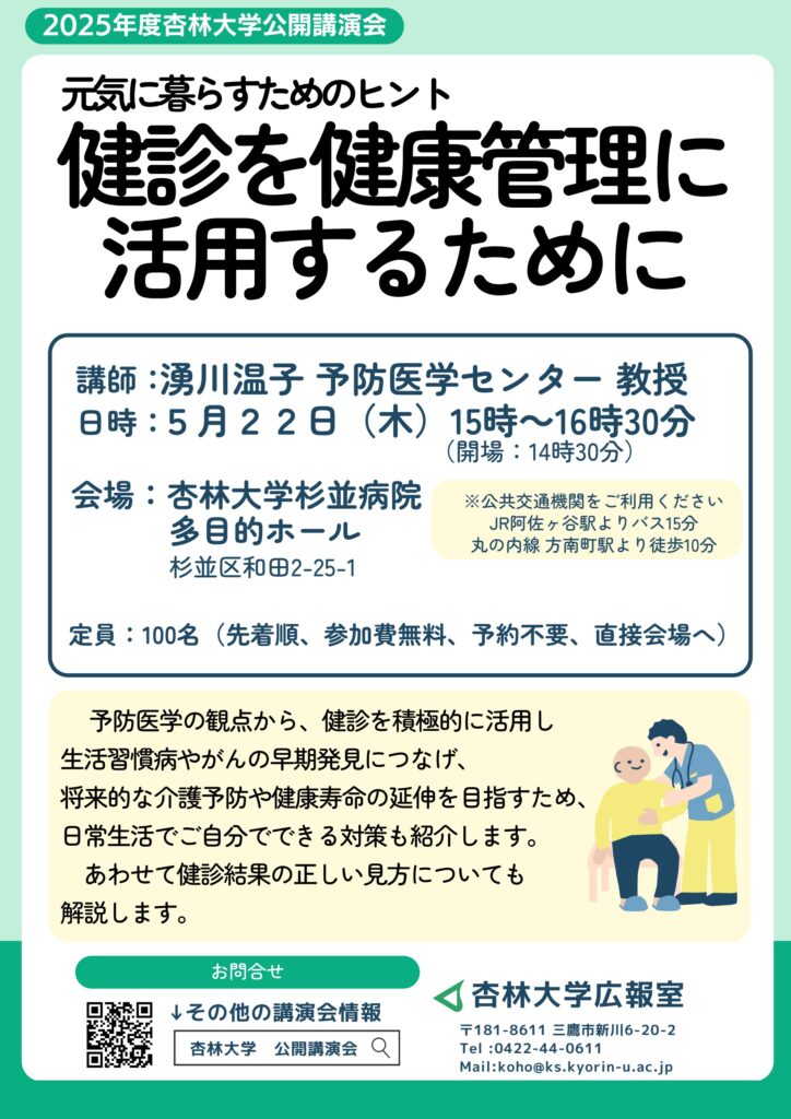 予防医学センター湧川温子教授による公開講演会を医学部付属杉並病院で開催します。