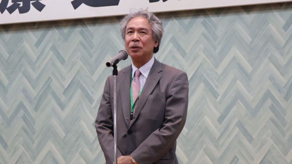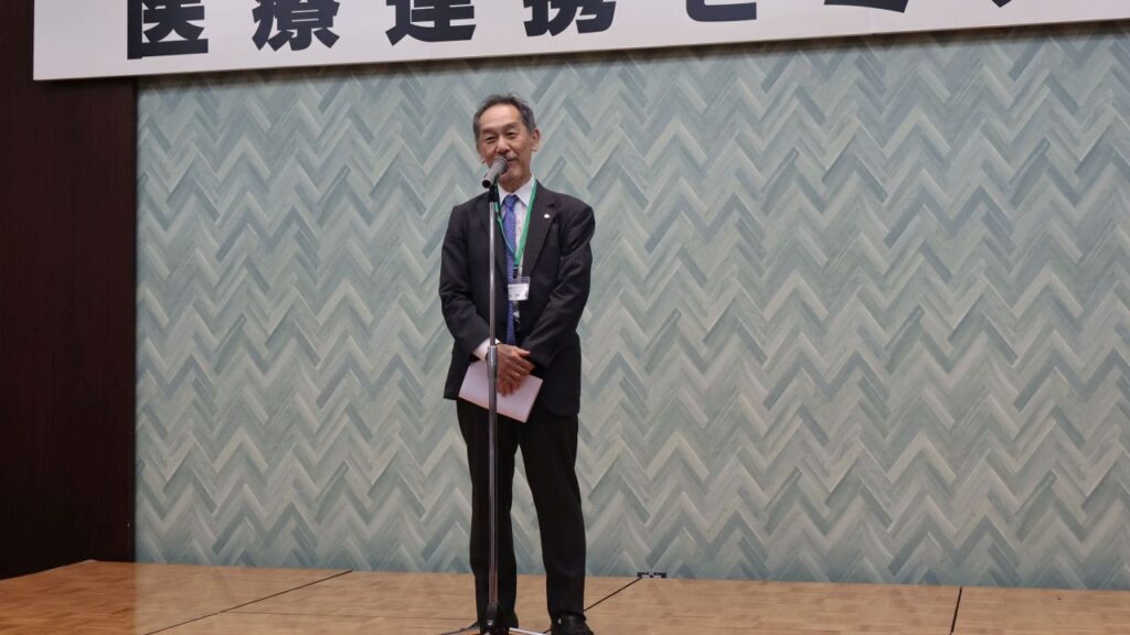 第2部は情報交換会として開かれました。冒頭、松田剛明学園長・理事長が登壇し、日頃からの地域医療機関の皆様の連携とご協力に対する感謝の意を述べました。続いて、市村病院長が挨拶に立ち、今後さらに強固な連携を築いていきたいという熱い思いを語りました。