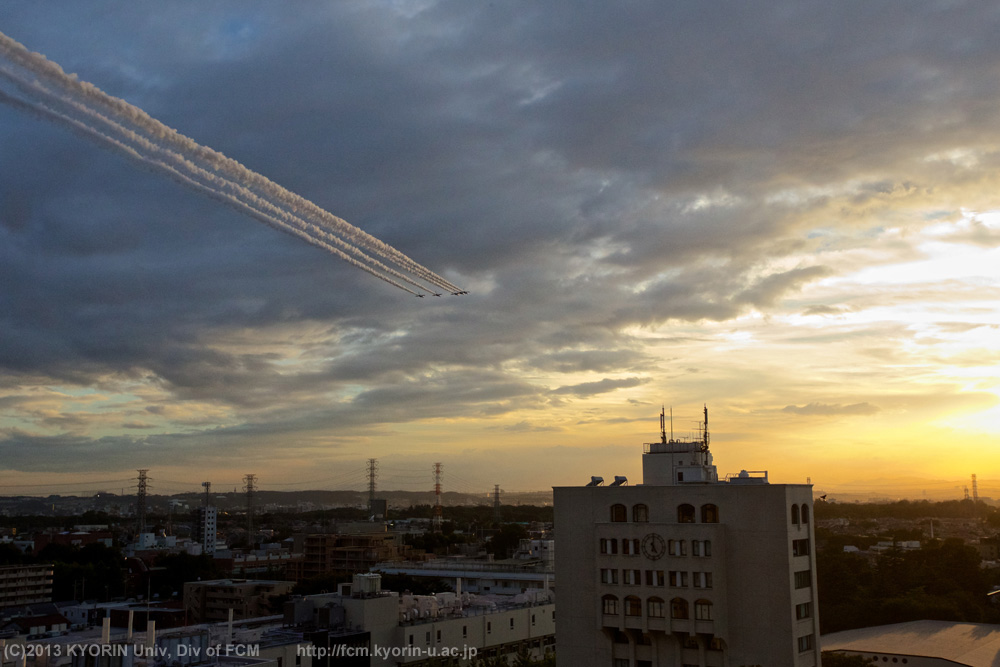 調布市・味の素スタジアム上空で1・2・3・4・6番機による課目「SUNRISE (サンライズ:日の出)」を展示飛行。杏林大学からは日の入(SUNSET)の方角に見ることができました。